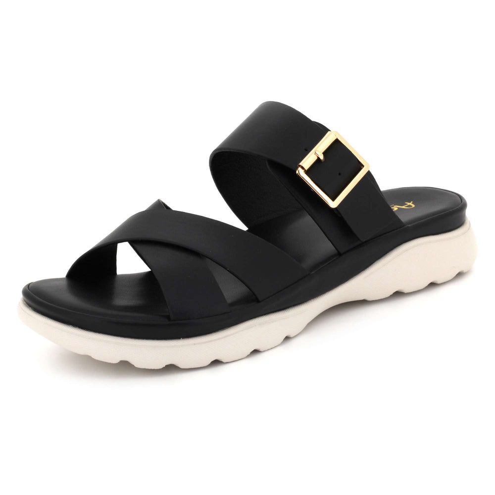 Enjoy effortless elegance and comfort with these slip-on wedge sandals. The cross-strap design, accented by a gold buckle, adds a touch of sophistication to your everyday style. Designed with a cushioned insole and lightweight wedge sole, these sandals offer the perfect balance of fashion and function. Ideal for summer walks, casual outings, or relaxed weekends — a must-have staple for any wardrobe.