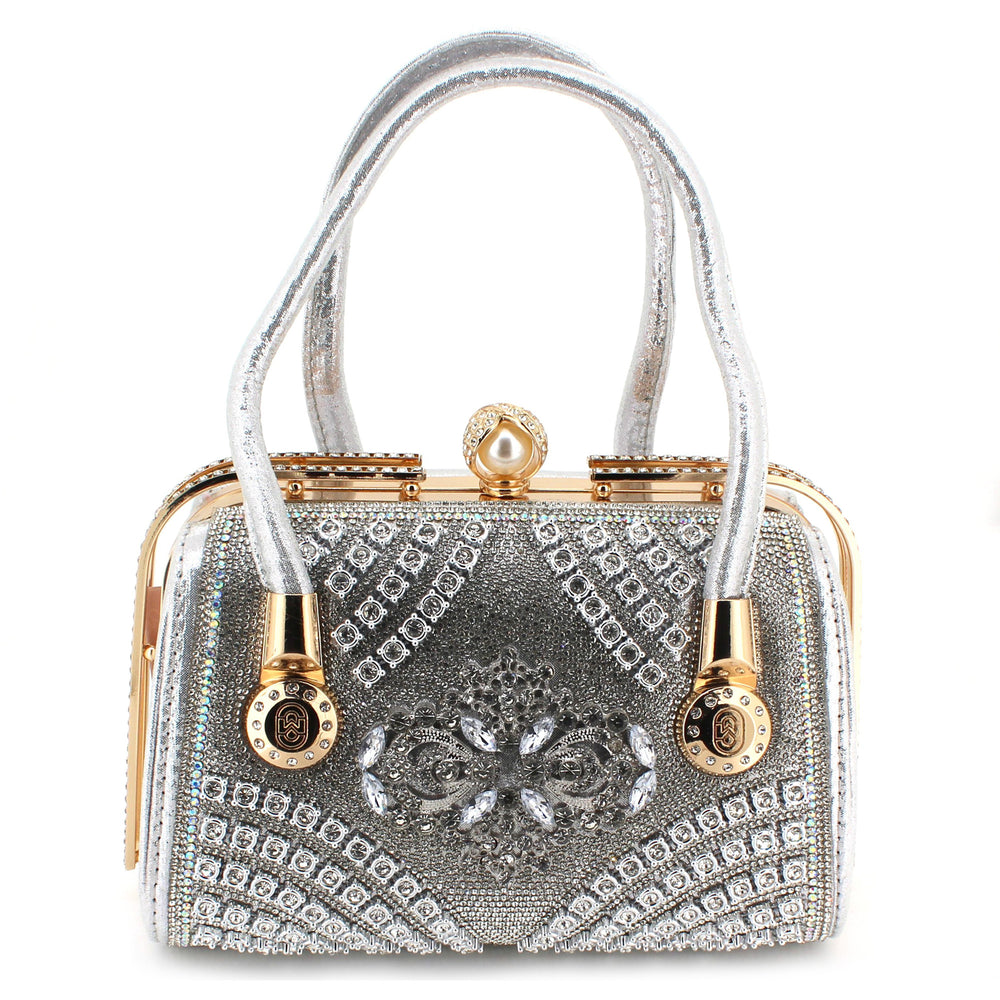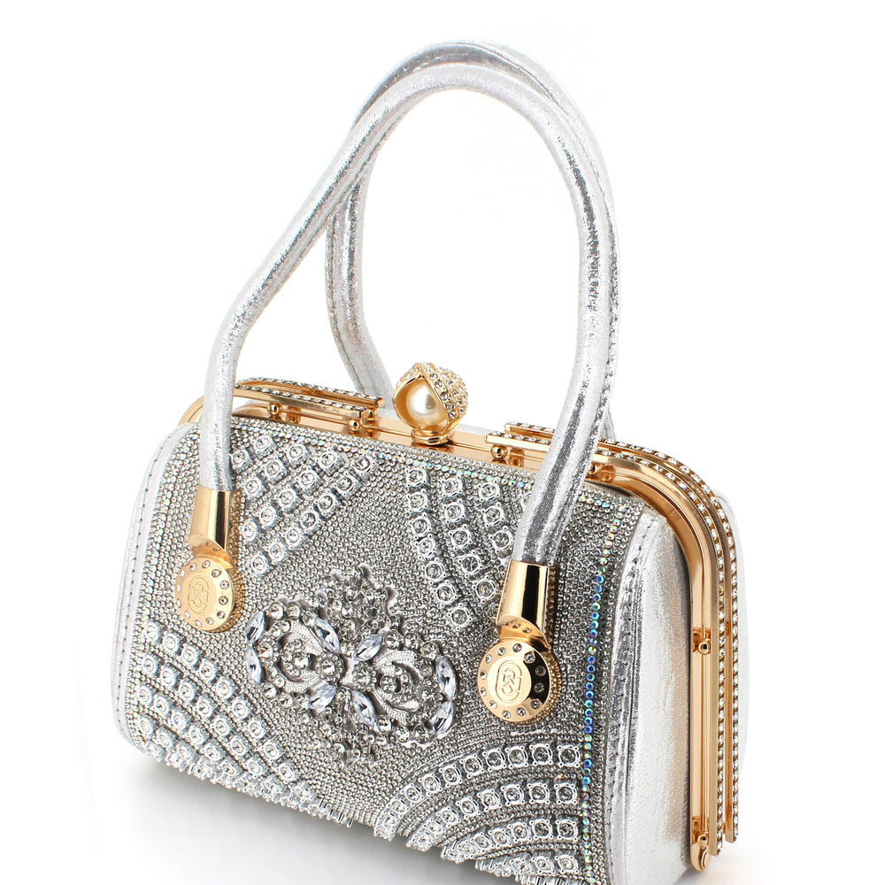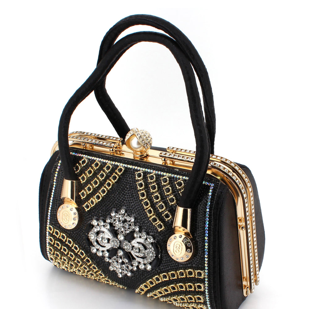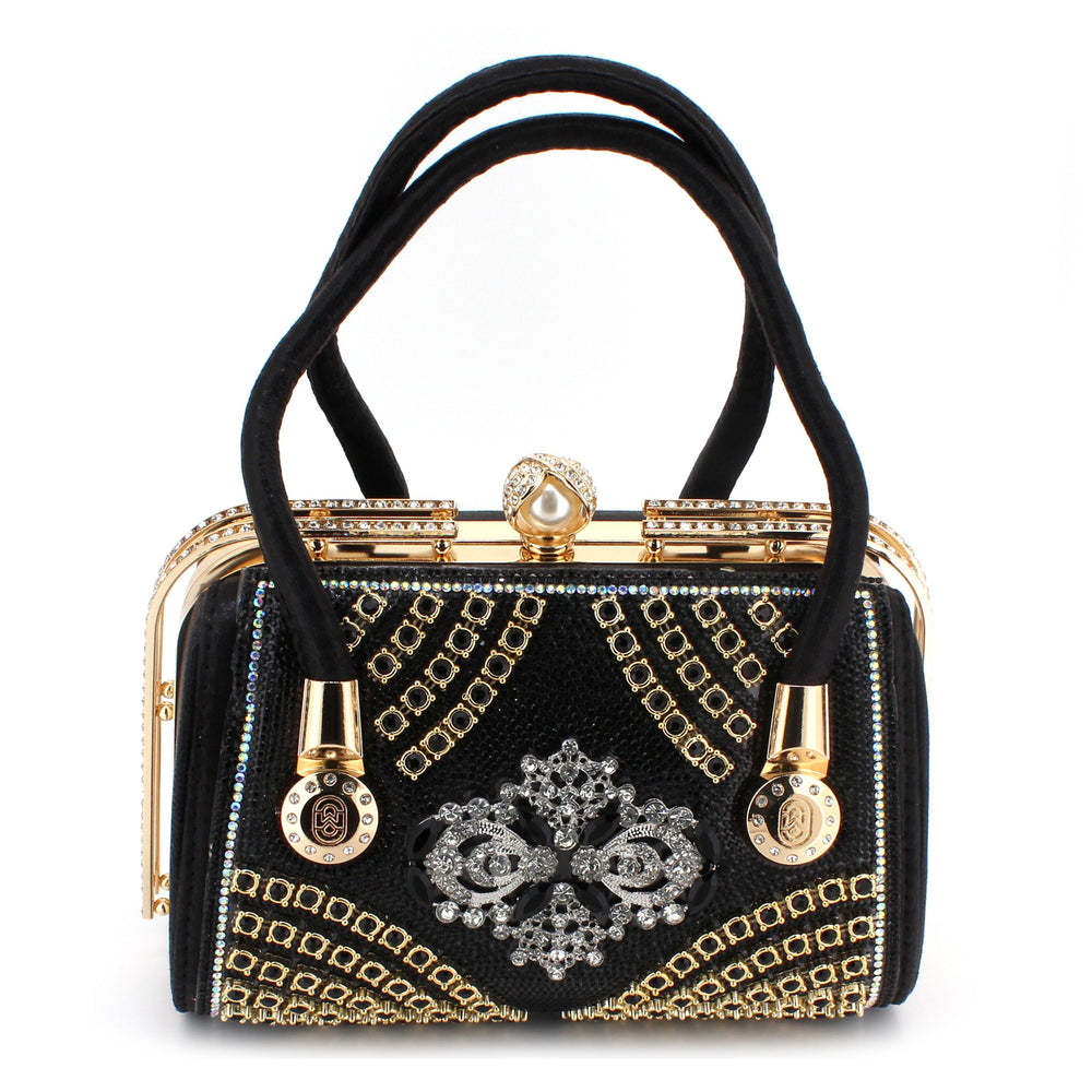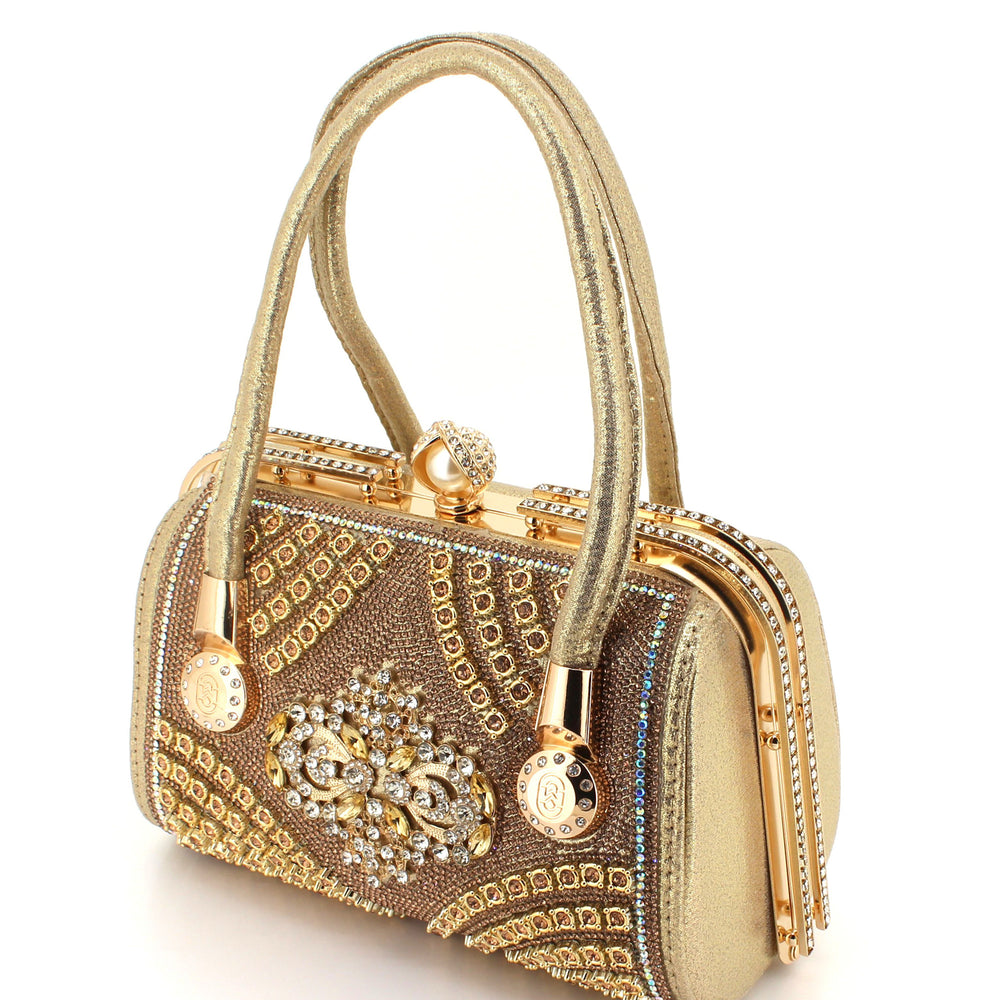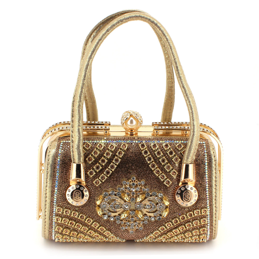 Elevate your style with this exquisite luxury evening handbag, designed for those who appreciate elegance and sophistication. Crafted with shimmering golden fabric and adorned with sparkling rhinestones, this handbag makes a bold fashion statement. The intricate floral crystal embellishment at the center adds a royal touch, while the structured frame and metallic top clasp ensure durability and timeless appeal.