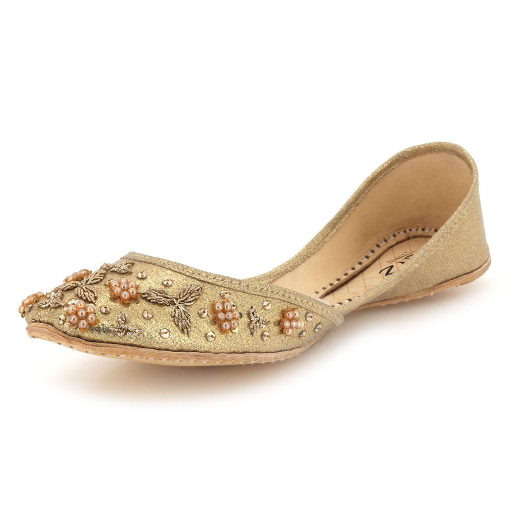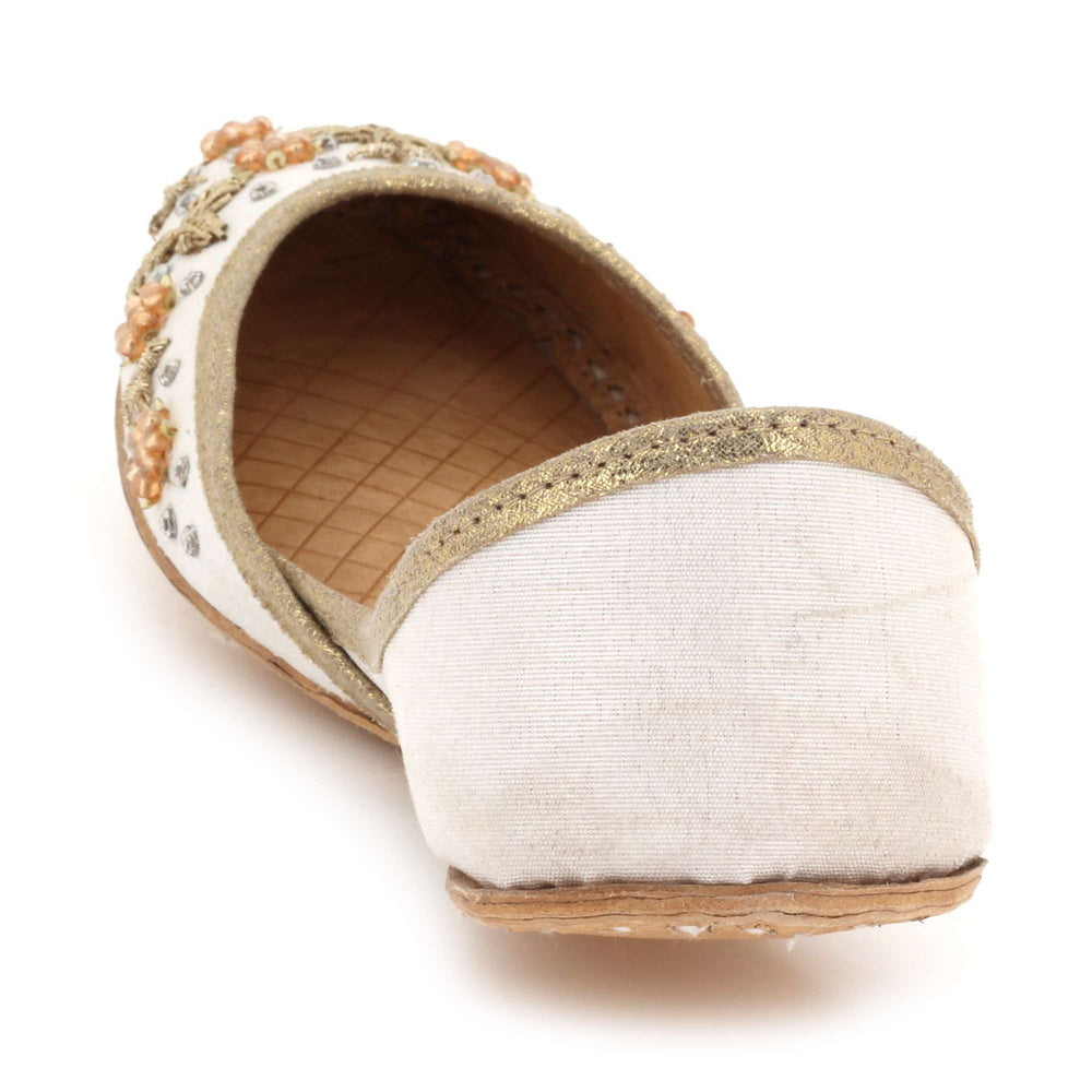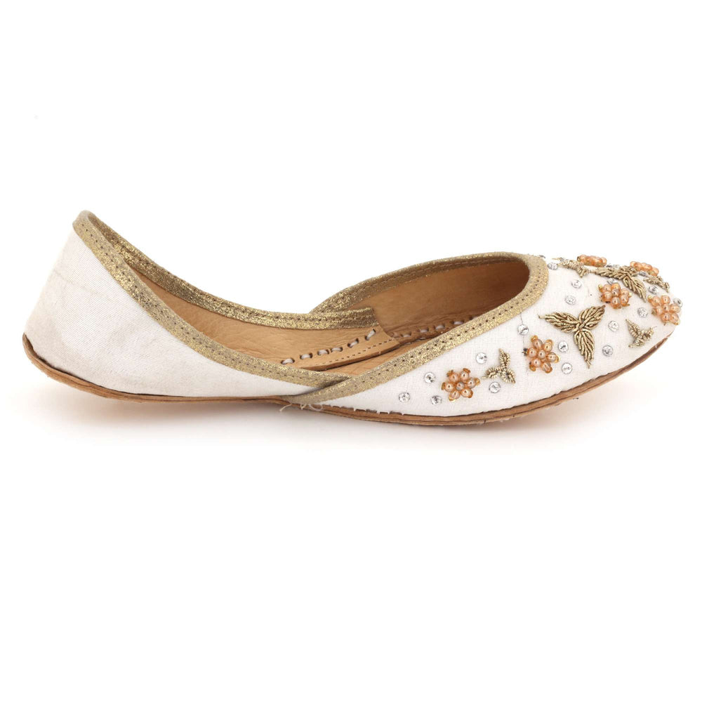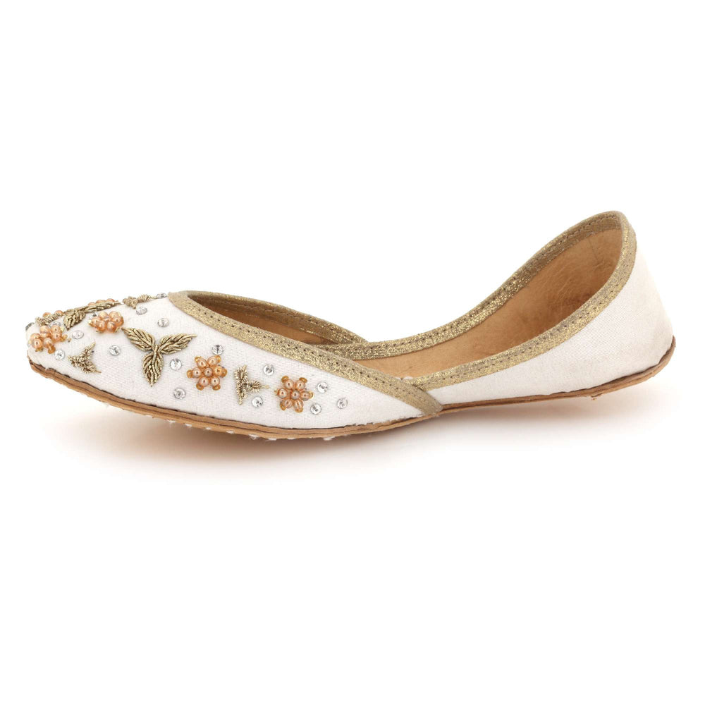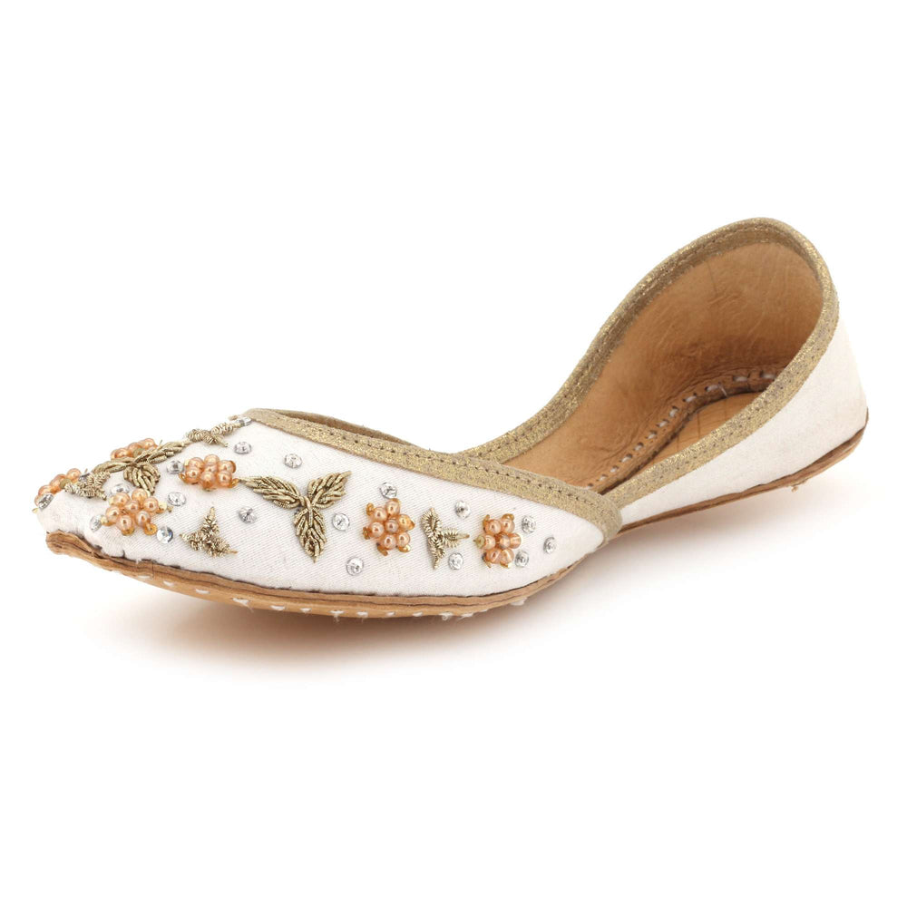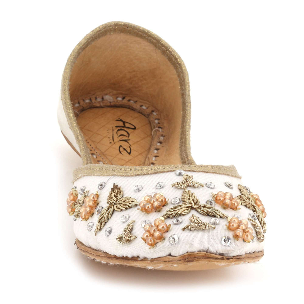 These ivory pearl embellished Punjabi khussa flats combine timeless traditional craftsmanship with elegant decorative detailing. Inspired by classic mojari footwear, they feature intricate beadwork and a cushioned interior for comfort throughout weddings, festive gatherings, and cultural celebrations. The soft ivory tone and refined embellishments create a graceful bridal look, making these handmade flats a perfect addition to both traditional and contemporary ethnic wardrobes.