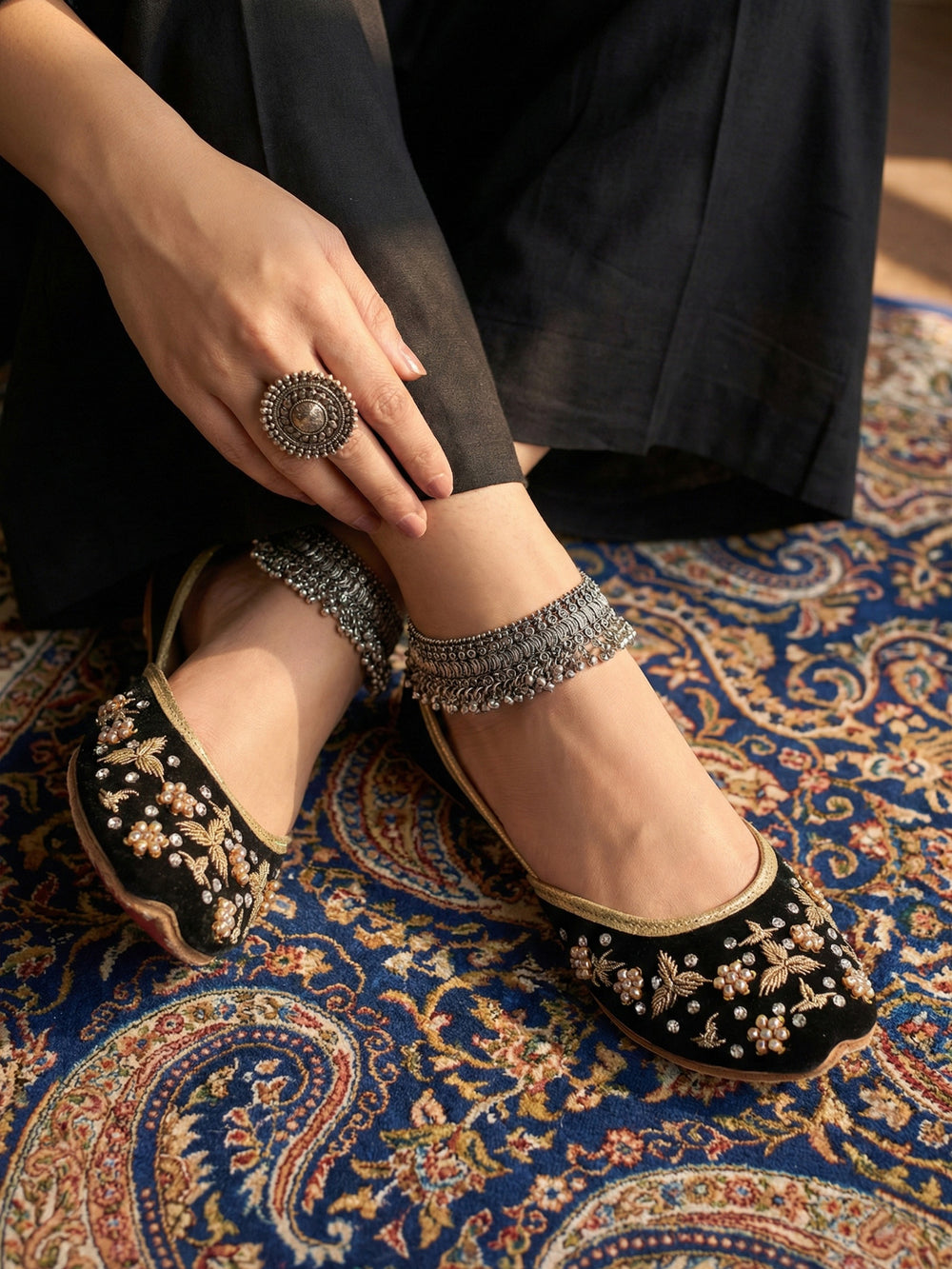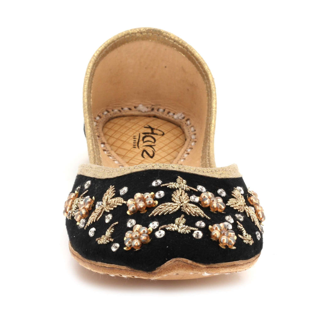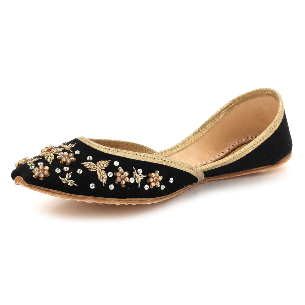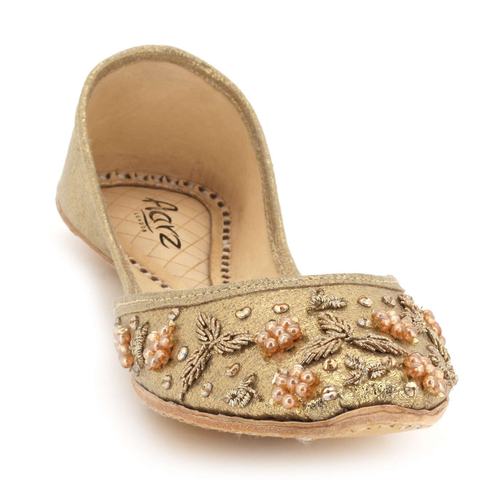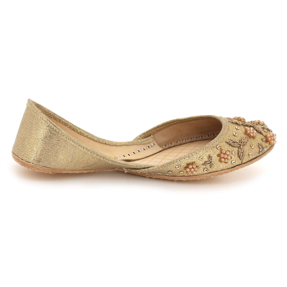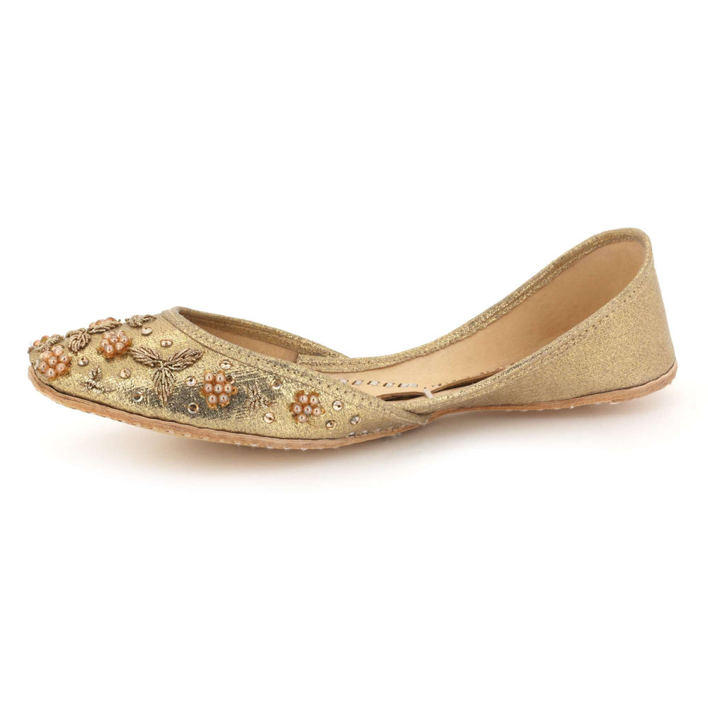 These ivory pearl embellished Punjabi khussa flats combine timeless traditional craftsmanship with elegant decorative detailing. Inspired by classic mojari footwear, they feature intricate beadwork and a cushioned interior for comfort throughout weddings, festive gatherings, and cultural celebrations. The soft ivory tone and refined embellishments create a graceful bridal look, making these handmade flats a perfect addition to both traditional and contemporary ethnic wardrobes.