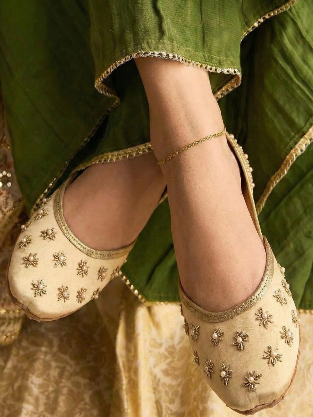 These embroidered Punjabi khussa flats showcase refined traditional craftsmanship with subtle star-inspired detailing and pearl accents. Designed for both elegance and comfort, they feature a cushioned interior and lightweight slip-on design ideal for weddings, festive celebrations, and cultural gatherings. The soft gold tone adds sophistication while remaining versatile enough to complement a wide range of traditional and contemporary outfits.