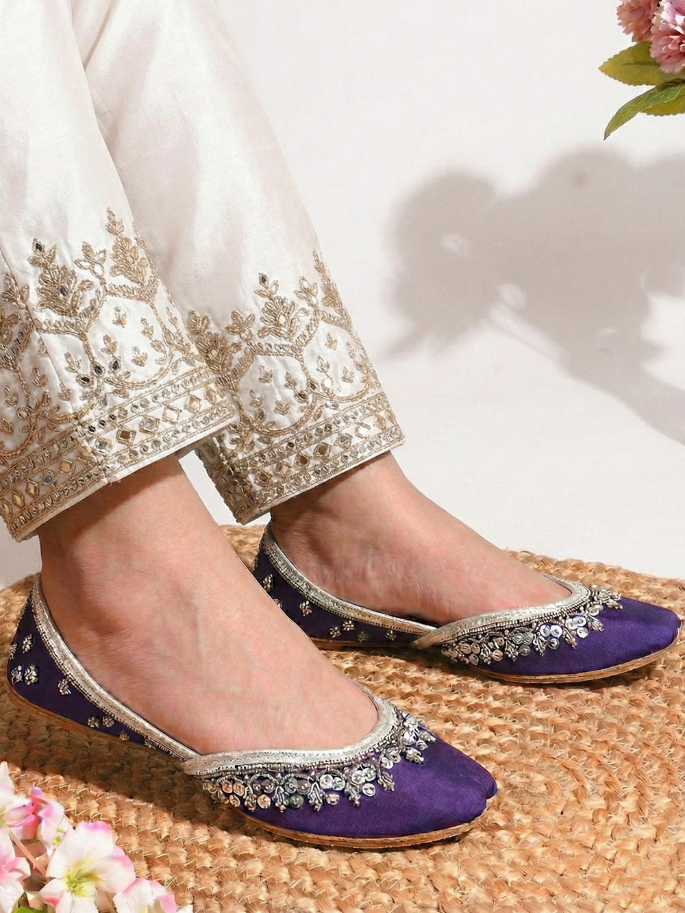 These embroidered Punjabi khussa flats combine vibrant color with traditional craftsmanship, featuring elegant silver floral detailing inspired by classic mojari footwear. Handmade with attention to detail, they offer both style and comfort through a cushioned interior and lightweight slip-on design. Perfect for bridal looks, weddings, festive occasions, and cultural events, these ethnic flats enhance both traditional and contemporary outfits with sophistication and charm.
