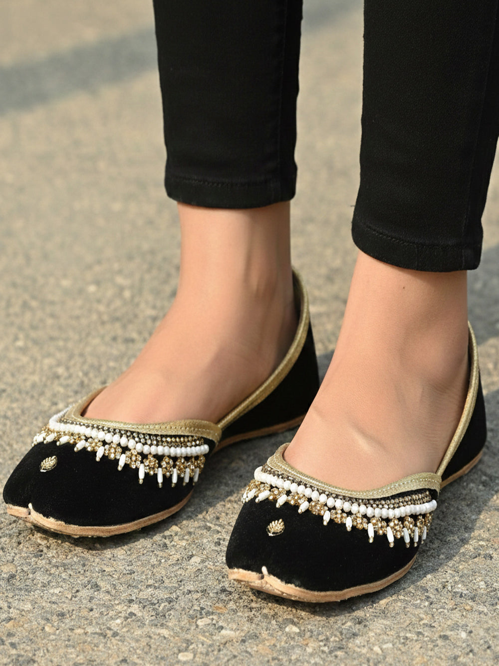 These black embellished Punjabi khussa flats showcase timeless traditional craftsmanship with intricate beadwork and elegant detailing. Inspired by classic mojari footwear, they combine cultural heritage with modern comfort through a cushioned insole and lightweight slip-on design. Perfect for weddings, festive celebrations, cultural events, or evening parties, these handmade khussa shoes elevate both traditional and contemporary outfits. Stylish, durable, and comfortable, they add a luxurious ethnic touch to any wardrobe.