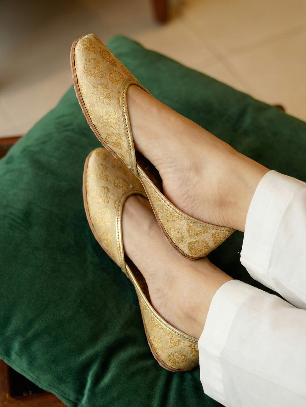 These classic gold Punjabi khussa flats showcase timeless traditional craftsmanship with a subtle embossed pattern inspired by classic mojari footwear. Designed to combine elegance with comfort, they feature a cushioned interior and lightweight slip-on structure ideal for weddings, festive celebrations, and cultural events. The versatile gold tone adds sophistication, making them a perfect choice for bridal styling or refined ethnic fashion.