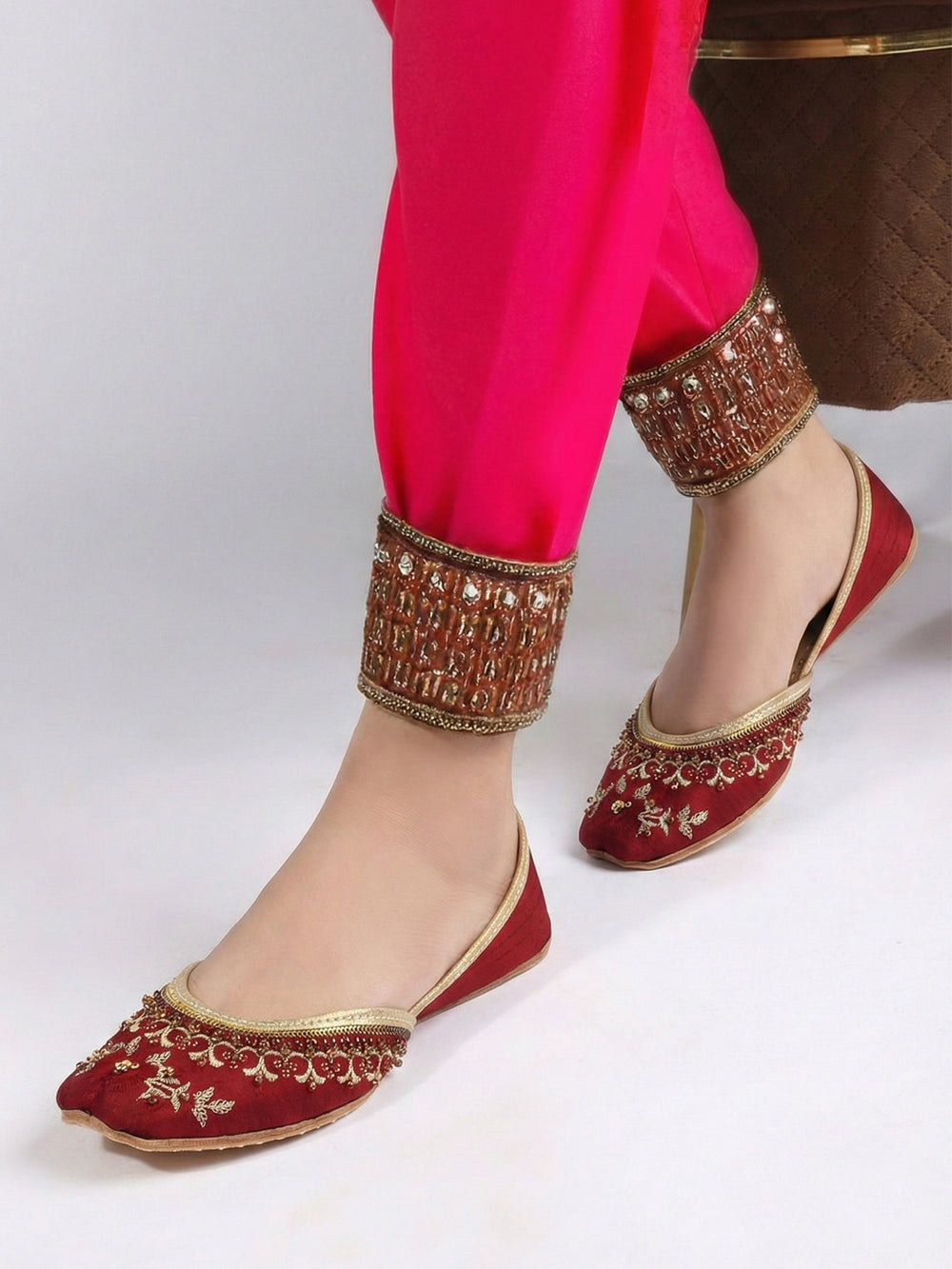 These embroidered Punjabi jutti flats showcase beautiful handcrafted detailing inspired by traditional khussa mojari footwear. Designed for elegance and comfort, they feature intricate embroidery that enhances their festive appeal while the cushioned insole ensures all-day wearability. Perfect for bridal looks, weddings, cultural celebrations, festivals, and special occasions, these slip-on flats combine heritage design with practical functionality. Lightweight, stylish, and versatile, they complement a wide range of traditional and modern outfits, adding a timeless ethnic charm to any wardrobe.