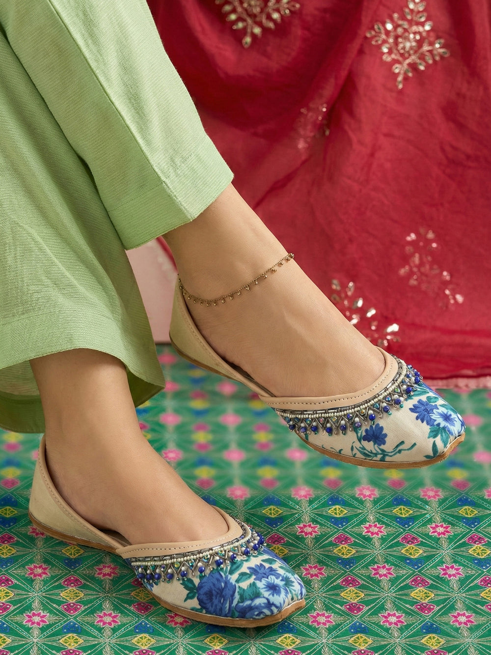 These blue floral Punjabi khussa flats showcase timeless craftsmanship with elegant printed patterns and beaded detailing inspired by classic mojari footwear. Designed for both comfort and style, they feature a cushioned interior and lightweight slip-on design ideal for weddings, festive celebrations, and cultural events. The fresh floral aesthetic adds charm and sophistication, making them a versatile addition to both traditional and contemporary wardrobes.