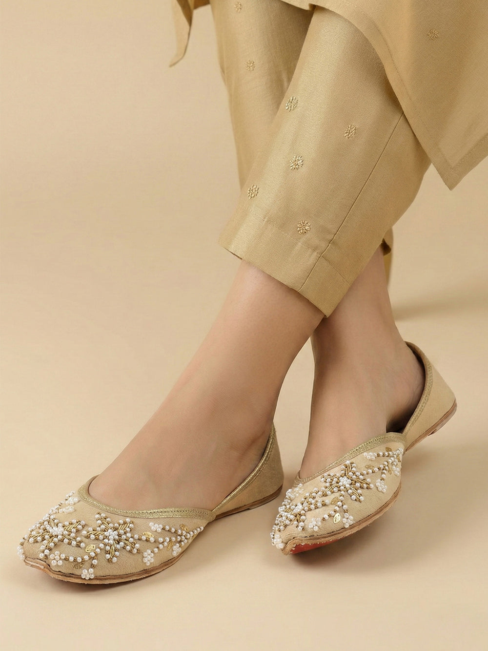 These pearl embroidered Punjabi khussa flats showcase refined traditional craftsmanship with elegant decorative detailing. Inspired by classic mojari footwear, the intricate embellishments create a sophisticated ethnic aesthetic while the cushioned interior provides lasting comfort. Designed for weddings, festive celebrations, and cultural occasions, these handmade slip-on flats combine heritage design with modern practicality. Their neutral tone and versatile style make them a timeless addition to any ethnic wardrobe.