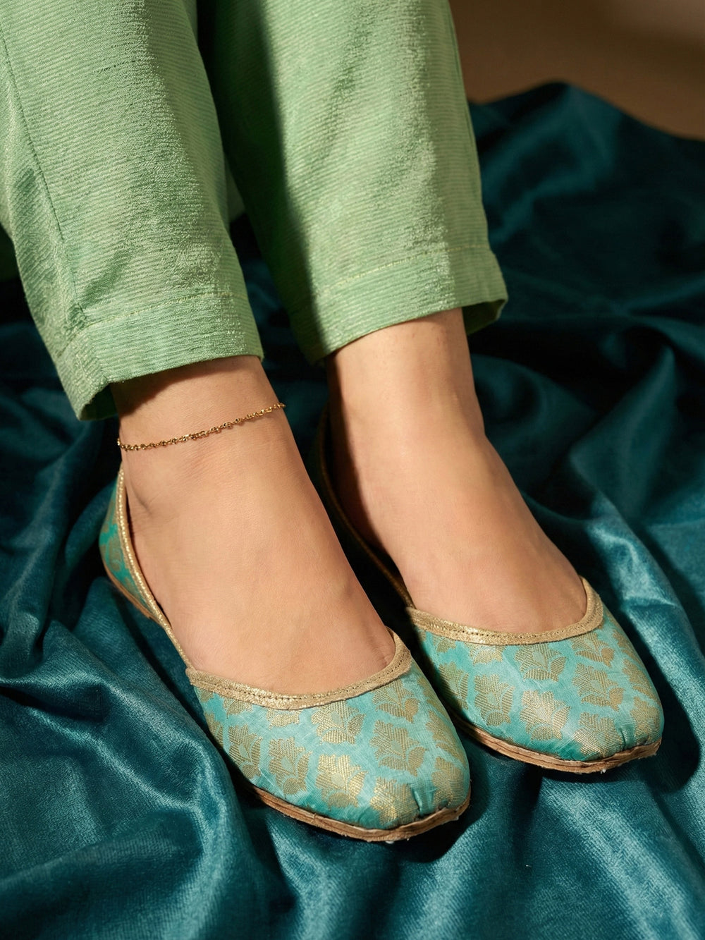 These turquoise brocade Punjabi khussa flats showcase traditional craftsmanship with intricate woven detailing inspired by classic mojari footwear. Designed for both comfort and elegance, they feature a cushioned interior and lightweight slip-on structure ideal for weddings, festive celebrations, and cultural occasions. The refreshing color combination adds charm and sophistication, making them perfect for bridal styling or contemporary ethnic fashion.