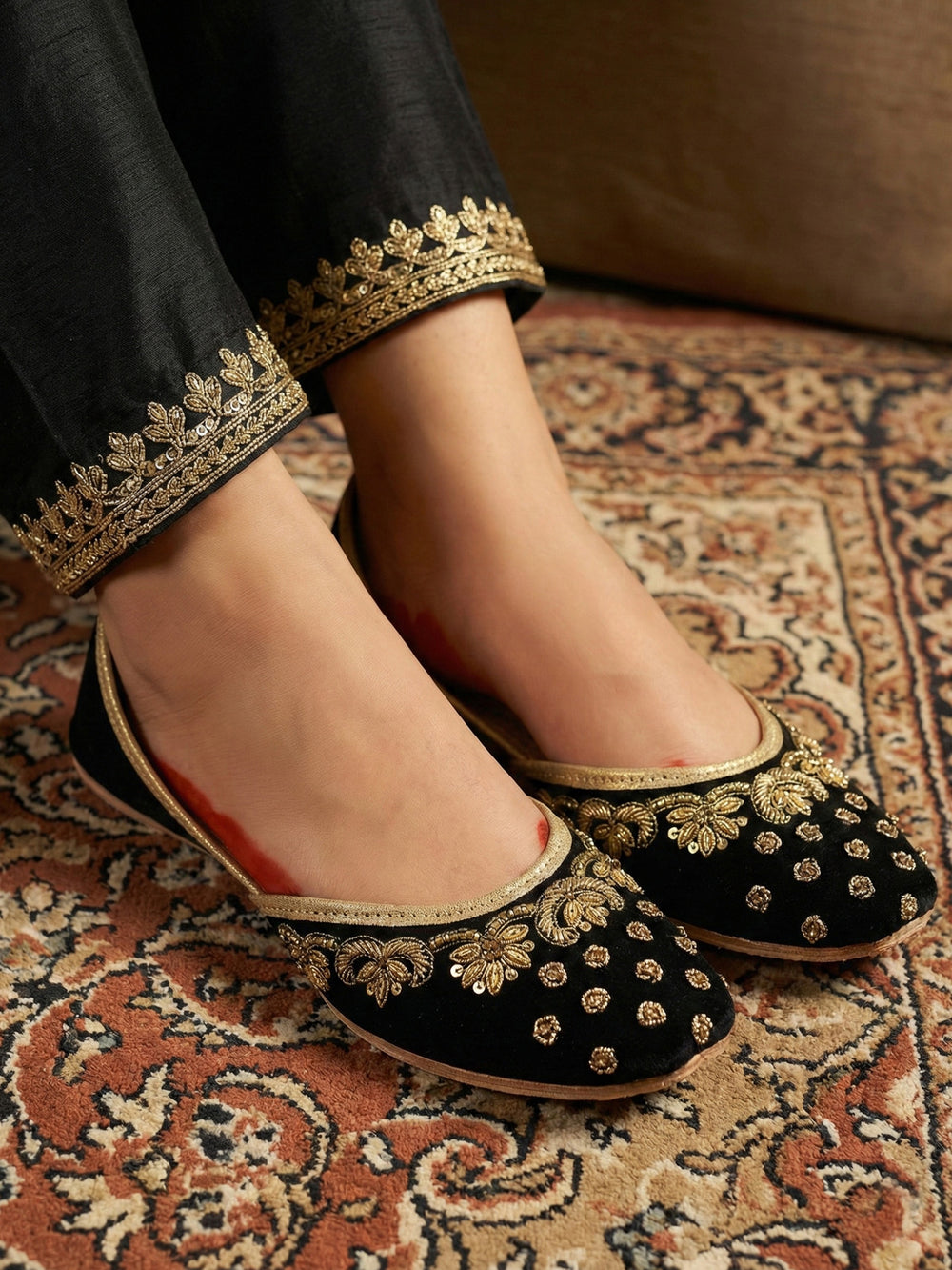 These black gold studded Punjabi khussa flats combine traditional craftsmanship with eye-catching embellishments inspired by classic mojari footwear. Designed for both comfort and style, they feature a cushioned interior and lightweight slip-on structure perfect for weddings, festive celebrations, and cultural gatherings. The bold black and gold combination adds sophistication and makes these handmade flats a statement piece for both bridal and evening ethnic fashion.